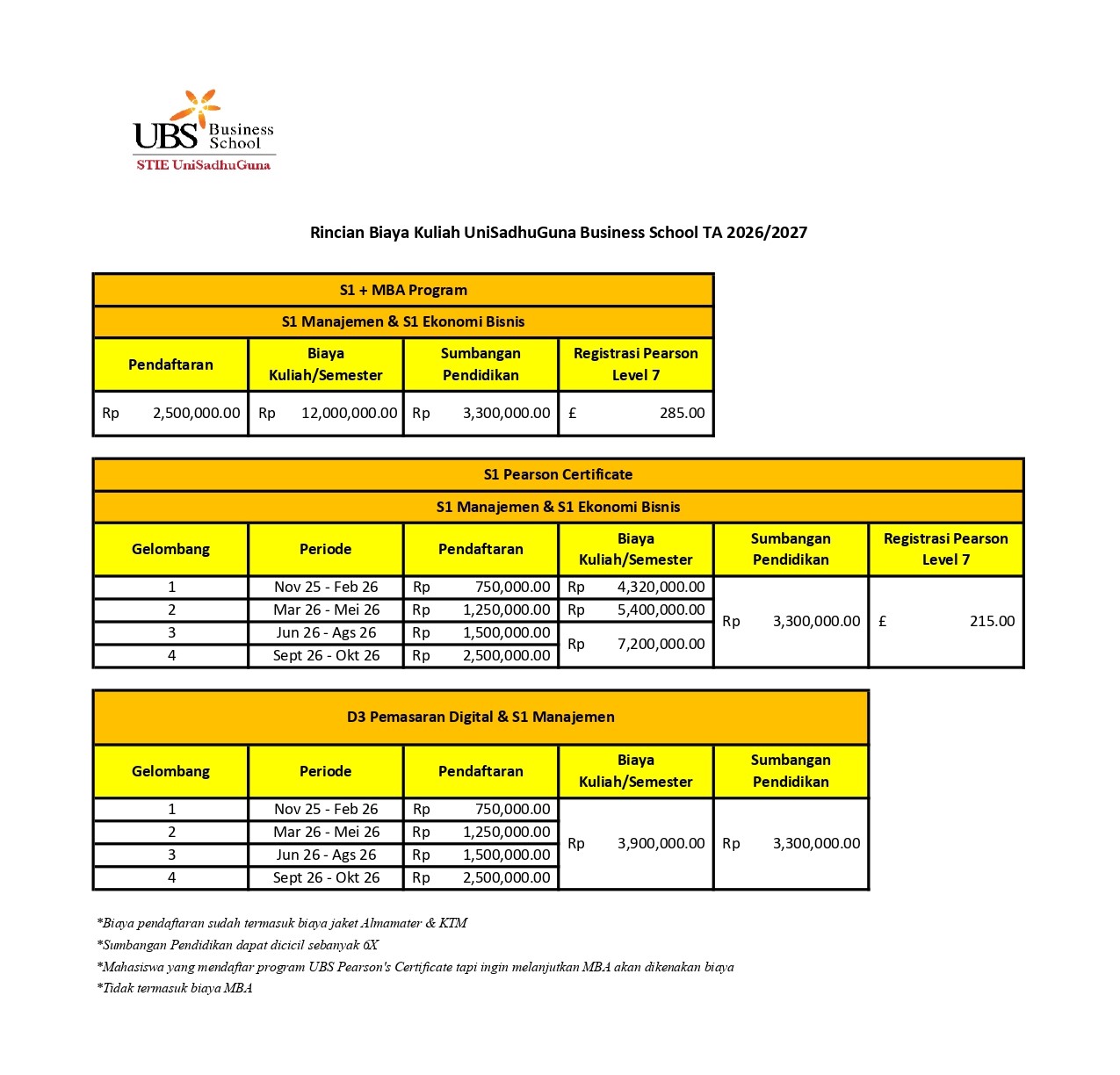 UniSadhuGuna Business School (UBS) didirikan dan dikelola oleh Yayasan Persaudaraan Bangbayang’66 (YPB’66) dan Lembaga Pendidikan UniSadhuGuna. UniSadhuGuna Business School (UBS) memberikan mutu kualitas pendidikan terbaik yang disiapkan untuk menjawab tuntutan industri dan dunia bisnis yang semakin kompetitif. UniSadhuGuna Business School (UBS) memiliki komitmen kuat untuk menghadirkan proses pembelajaran akademis dan nonakademis yang berkualitas dan terintegrasi. UBS telah bekerja sama dengan Cardiff Metropolitan University dan telah mengadopsi kurikulumnya, sehingga memberikan kemudahan bagi mahasiswa yang ingin melanjutkan studi dan memperoleh gelar MBA di Cardiff Metropolitan University melalui jalur yang lebih terstruktur dan efisien.